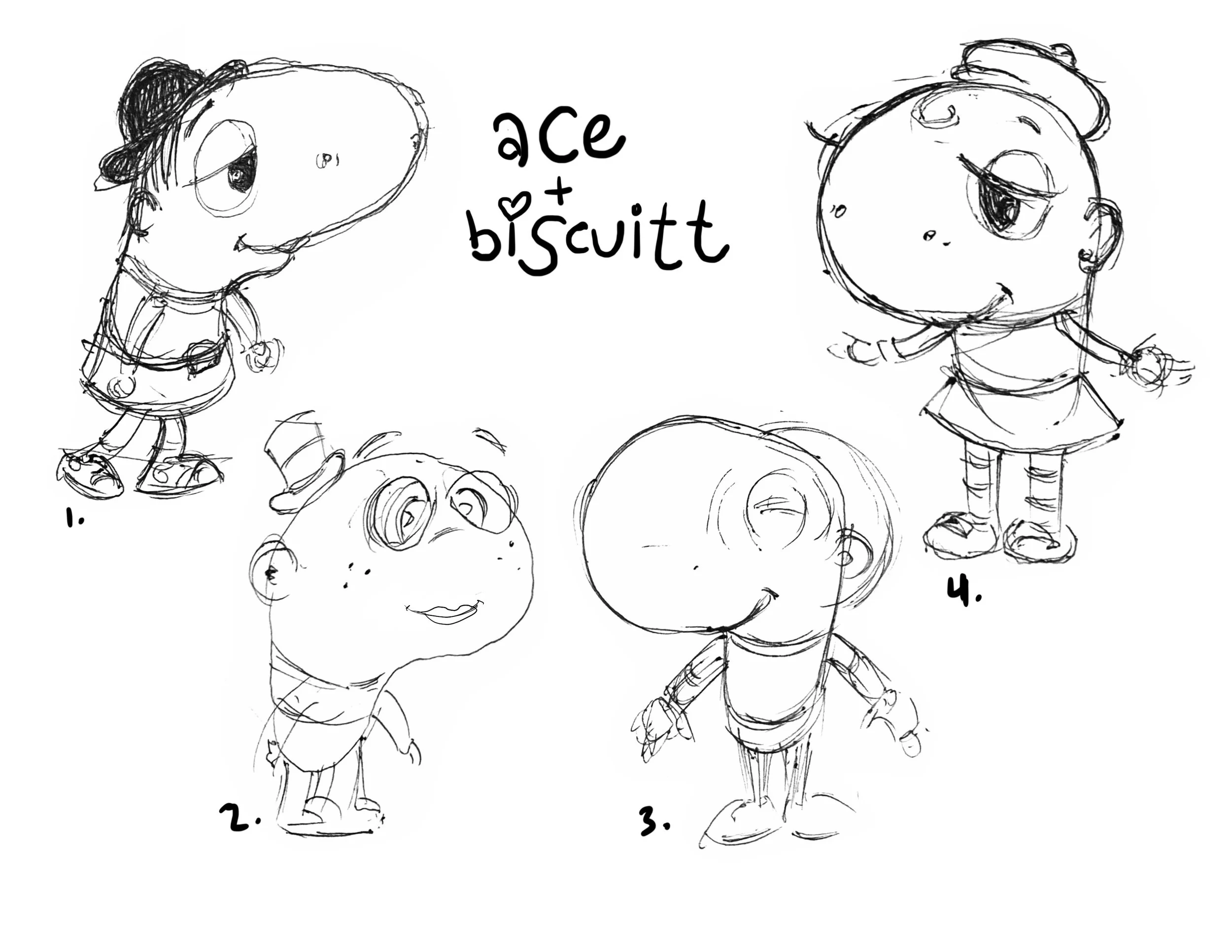 Sketched cartoon characters with playful expressions labeled 1 through 4, featuring various outfits and accessories. The phrase "ace + biscuit" is written in stylized text above them.