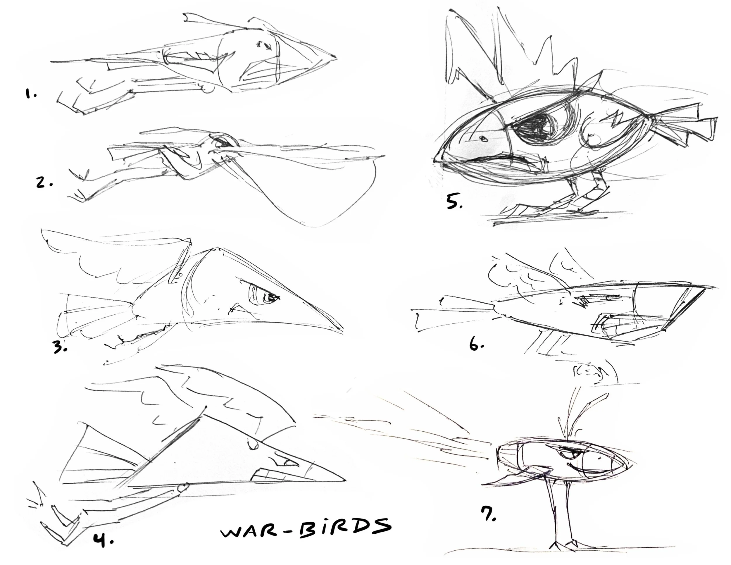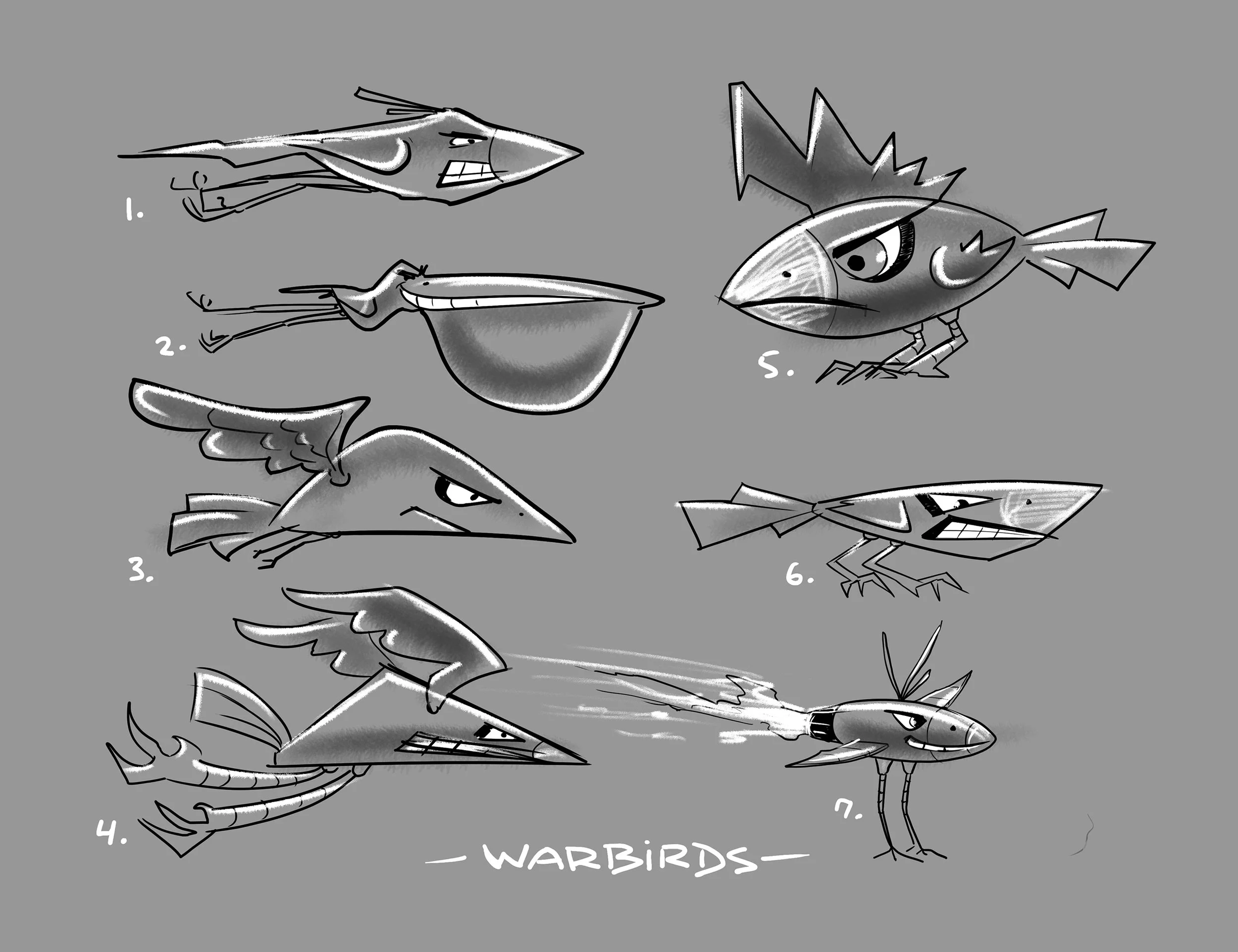 Cartoon sketches of seven stylized bird-like characters labeled 1 to 7, titled 'Warbirds,' each with unique features like wings and beaks against a gray background.