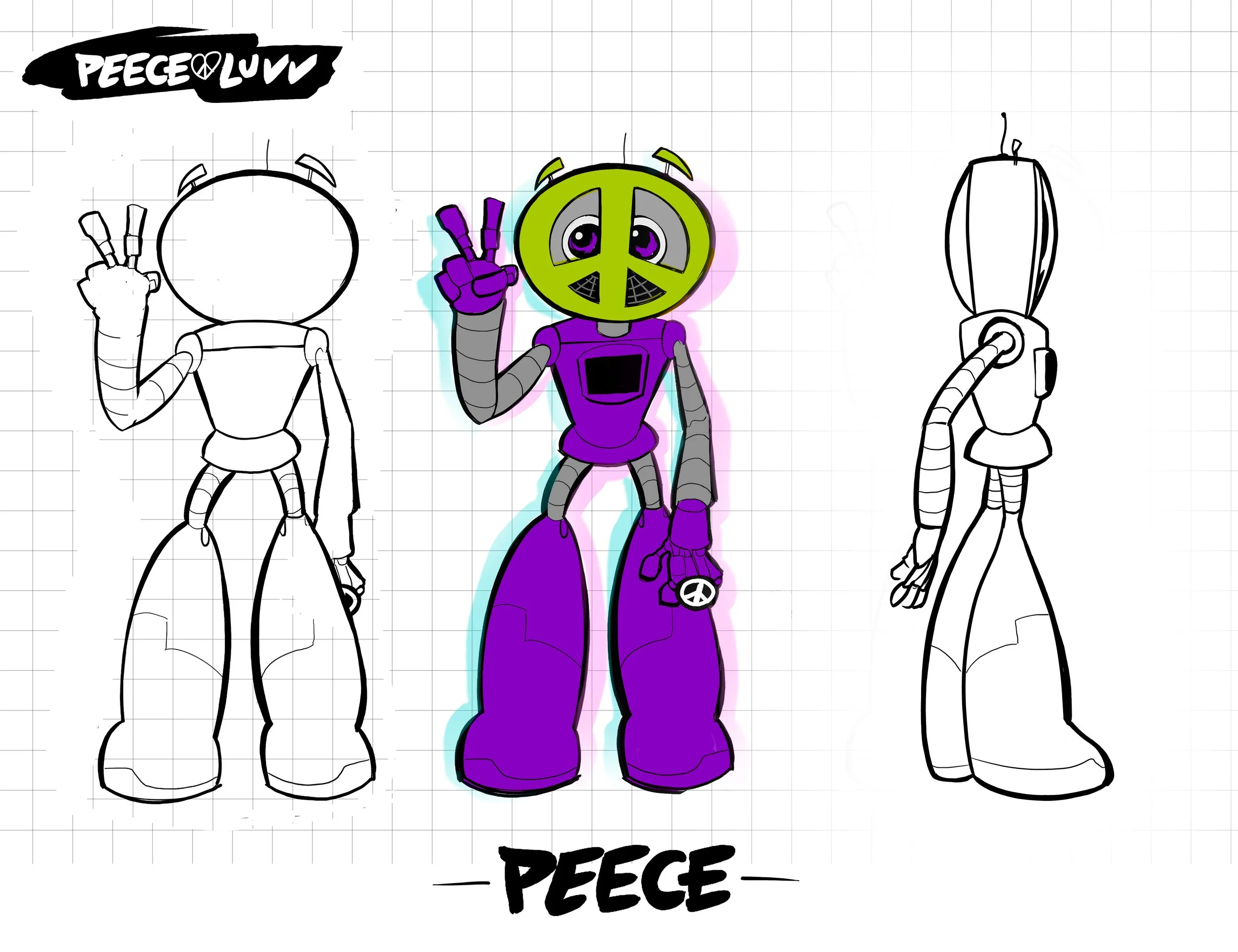 Character design of a robot named Peece. The robot has a peace symbol as its face, with green and purple coloring, and is shown in three different views on a grid background. The first and last view are uncolored, while the middle view is colored. Th