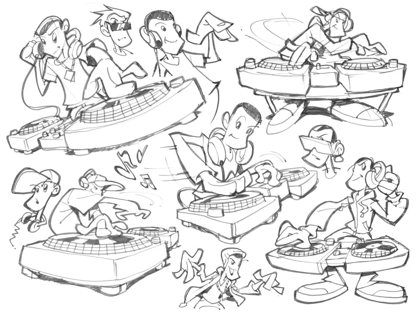 Cartoon drawings of DJs wearing headphones, performing on turntables with various poses and expressions, surrounded by music notes.