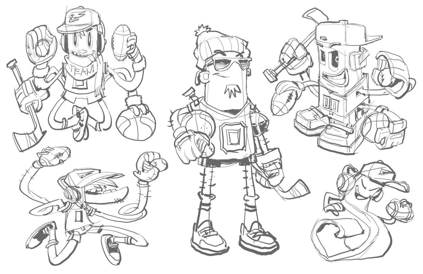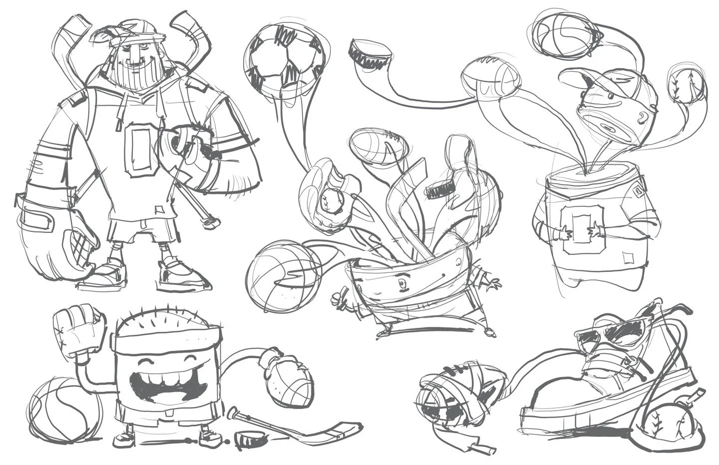 Sketches of cartoon athletes, including a monster and characters with sports gear like hockey sticks and footballs.