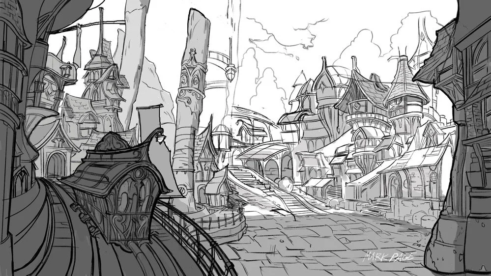 Sketch of a fantasy-style room with curved architecture, hanging lanterns, and an open fireplace. The room features bookshelves, a doorway, potion bottles, and a round window with curtains.