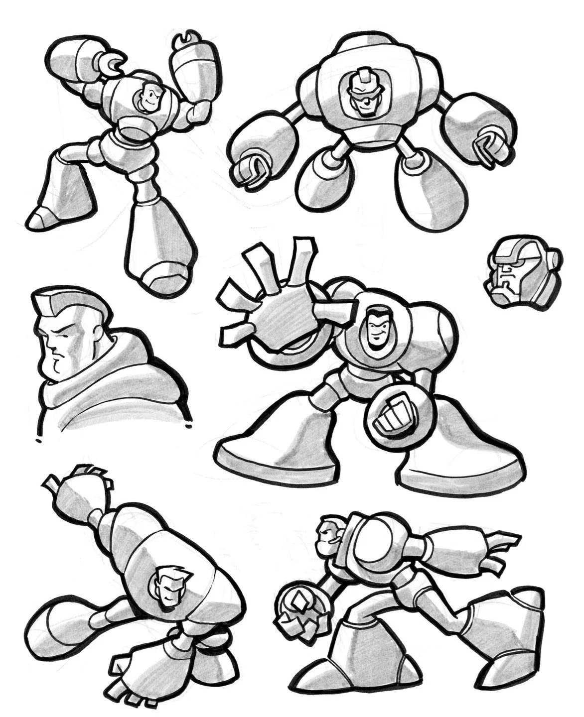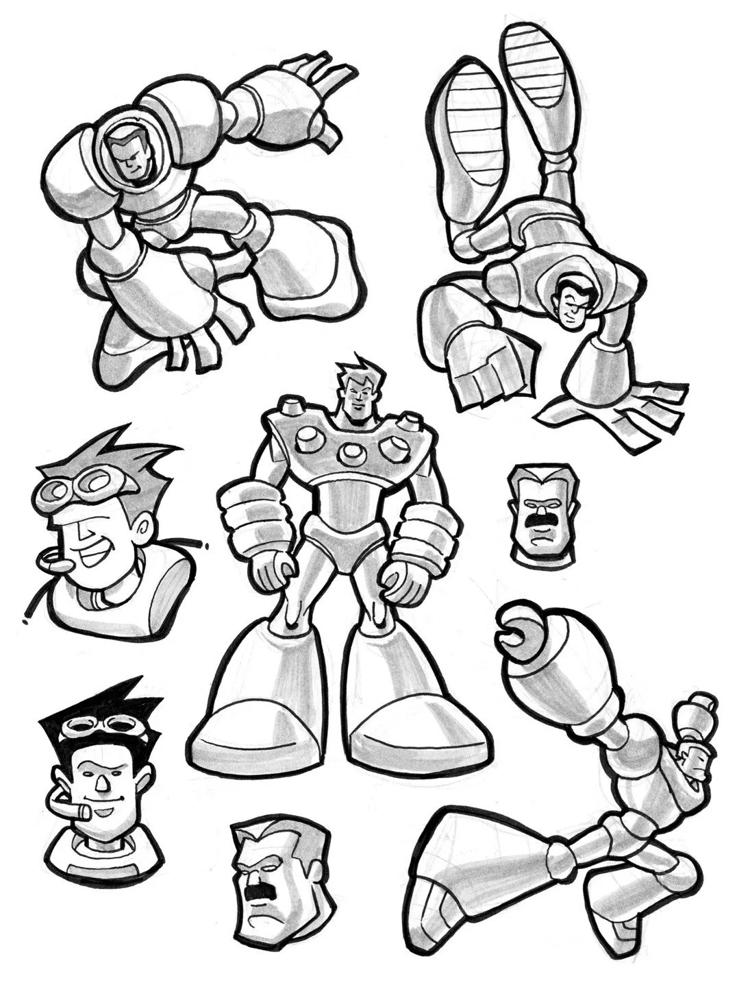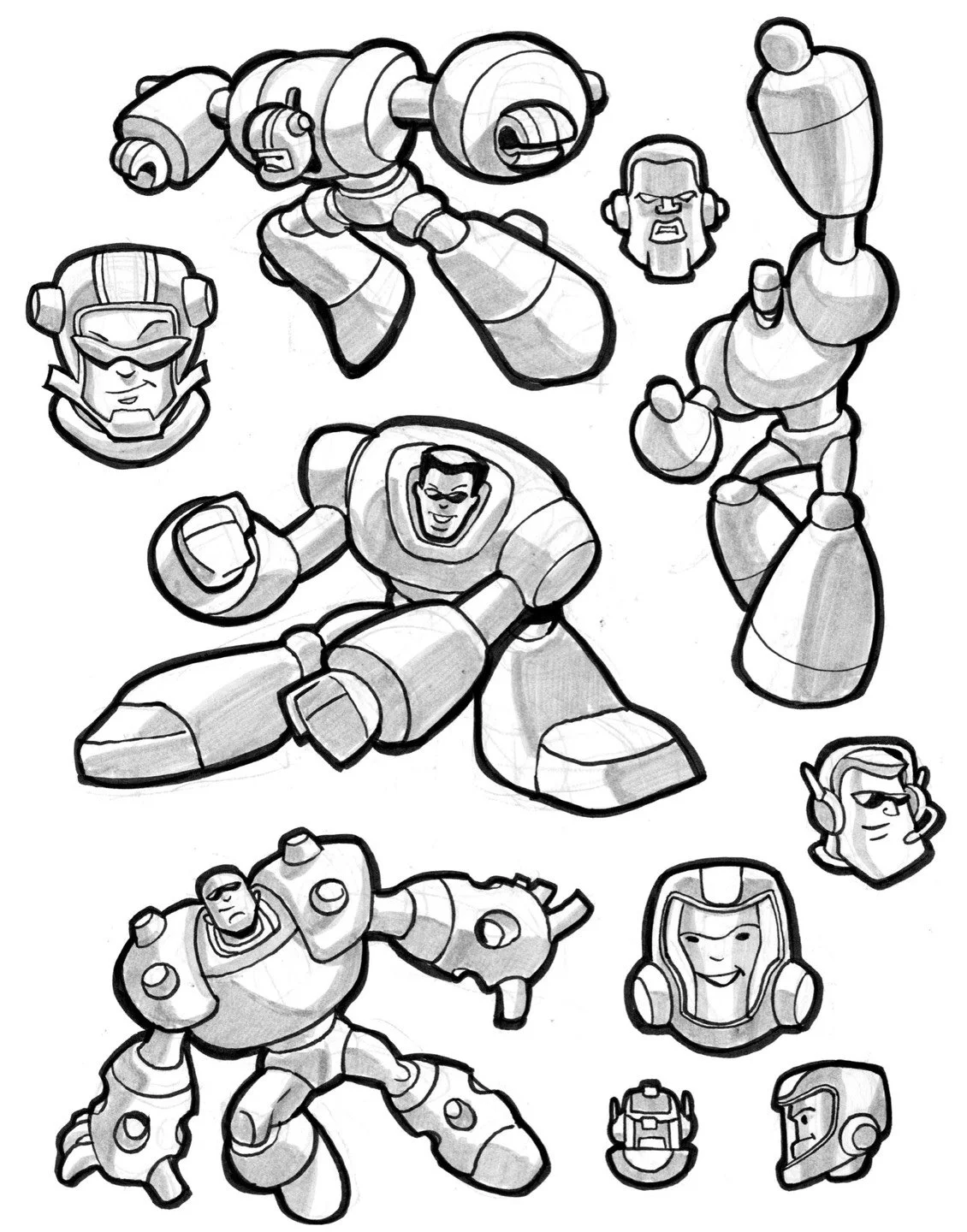 Sketches of robotic figures with human-like faces and large mechanical limbs, showcasing various poses and facial expressions.