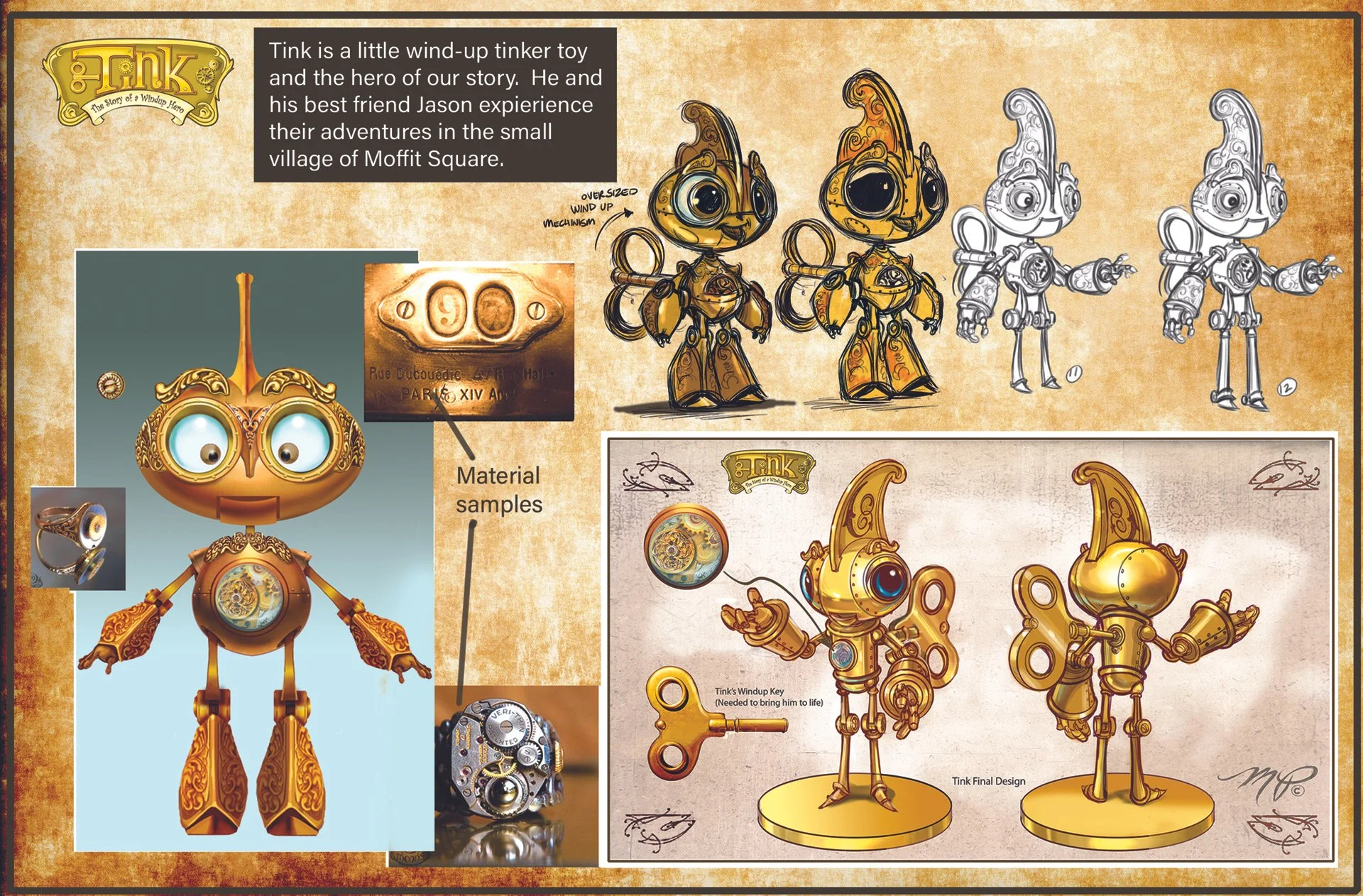 Concept art and sketches of "Tink," a wind-up toy character. The image includes detailed design elements, material samples, and various poses of Tink. The character has a large, expressive face, intricate patterns, and a wind-up key on its back. Text