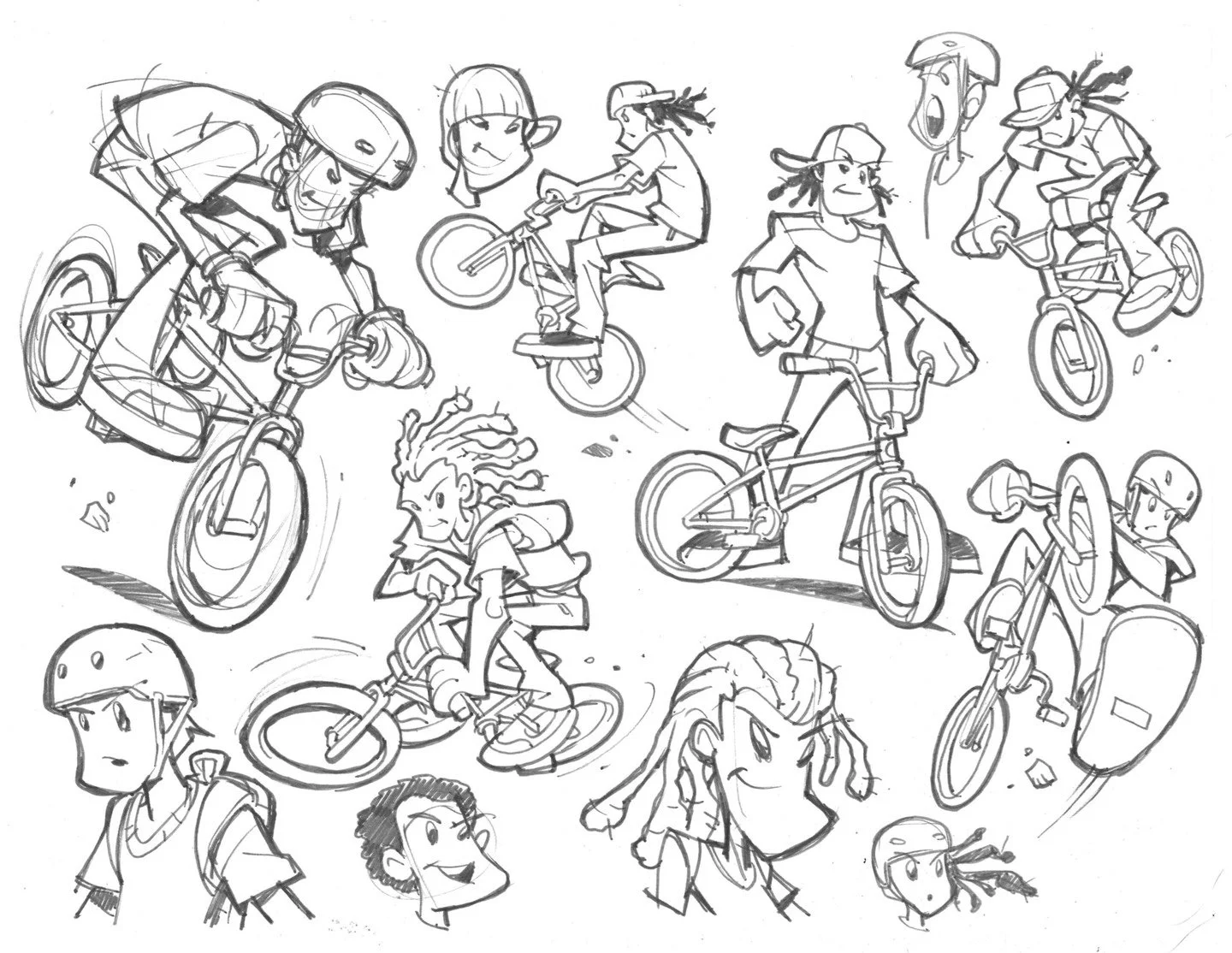 Sketch of cartoon characters riding bicycles, performing tricks and wearing helmets. Includes various poses and expressions.