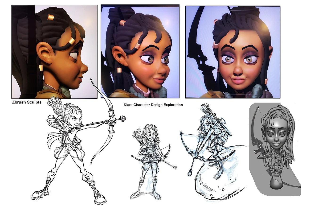 A digital character design showing a 3D ZBrush sculpt and several sketches of a female archer character with braided hair and a bow. The images depict different angles and stages of character development and design exploration, labeled "Zbrush Sculpt