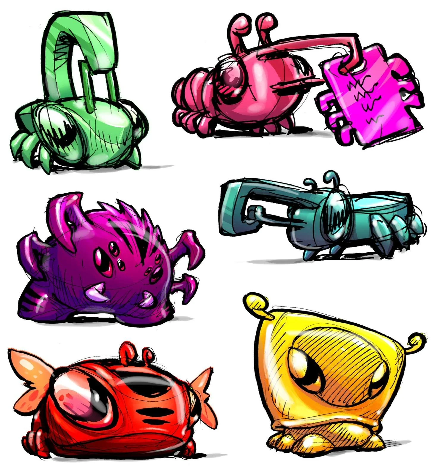 Colorful cartoon creatures with various shapes and designs, including a green lock-style creature, pink crab with a puzzle piece, purple spiky animal, turquoise key-shaped figure, red bug with wings, and yellow bag-like being.