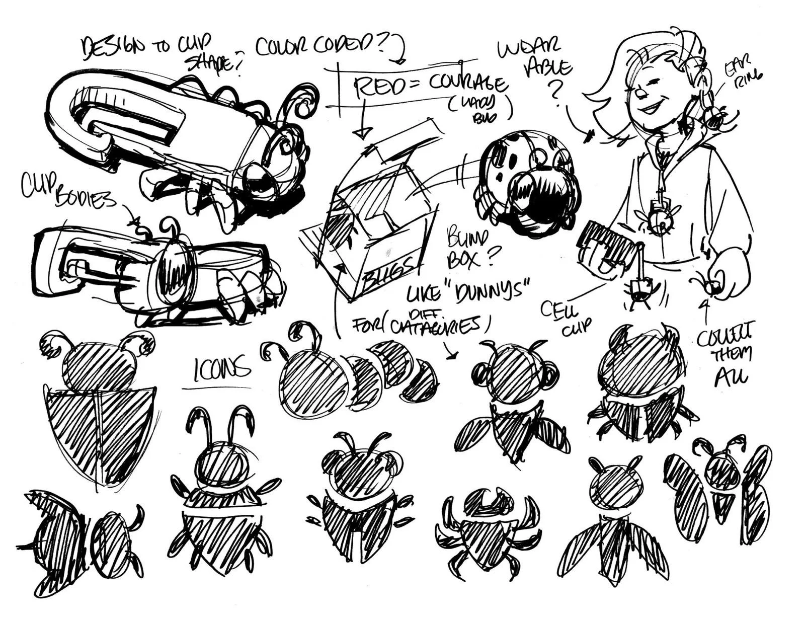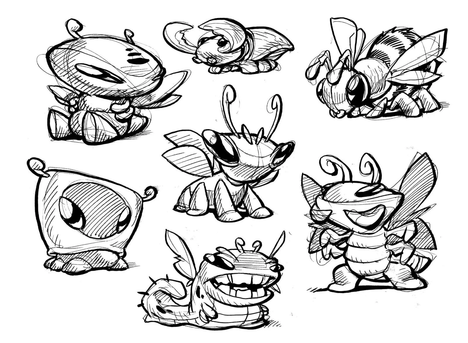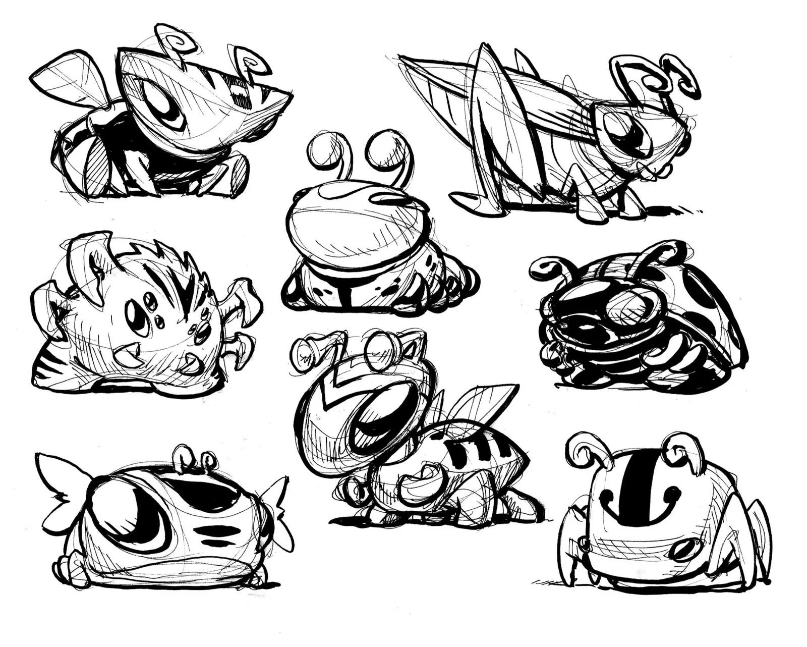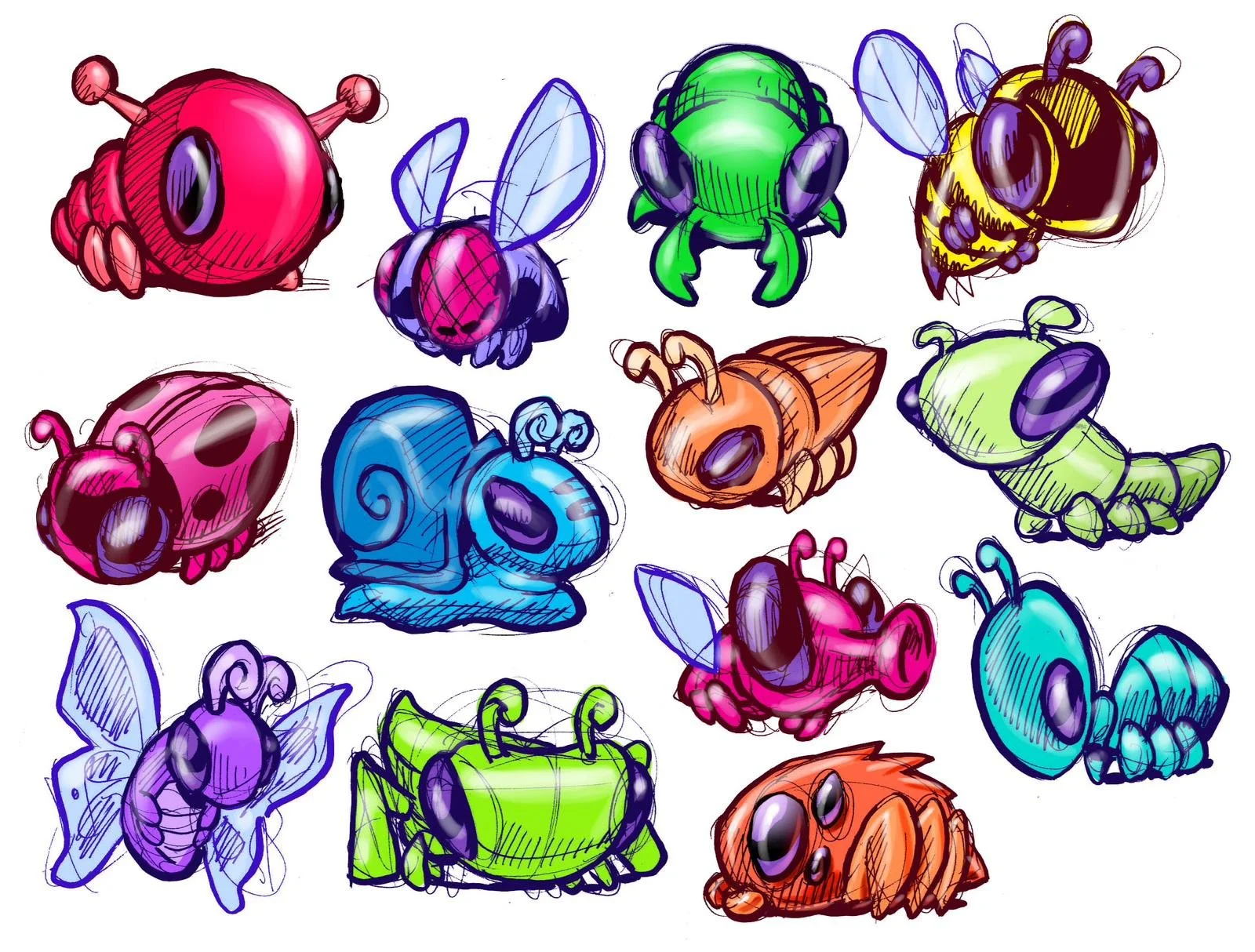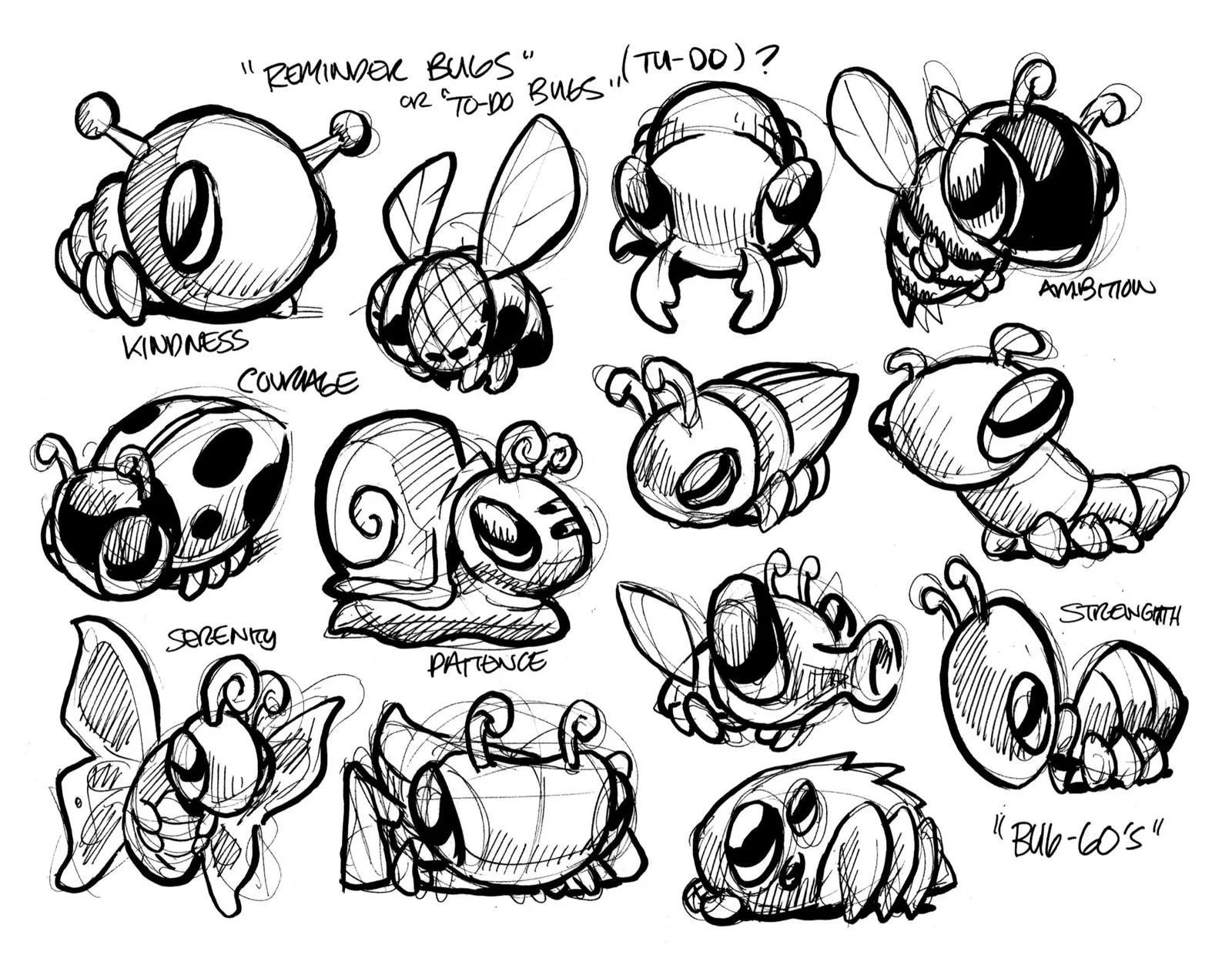 A collection of cartoon-style bug sketches with various designs and expressions.
