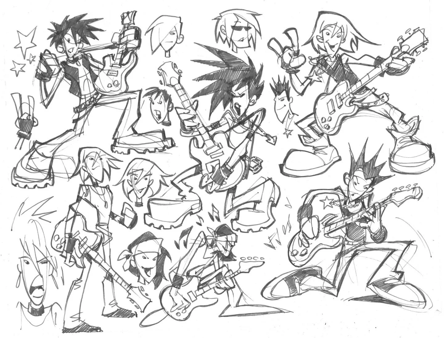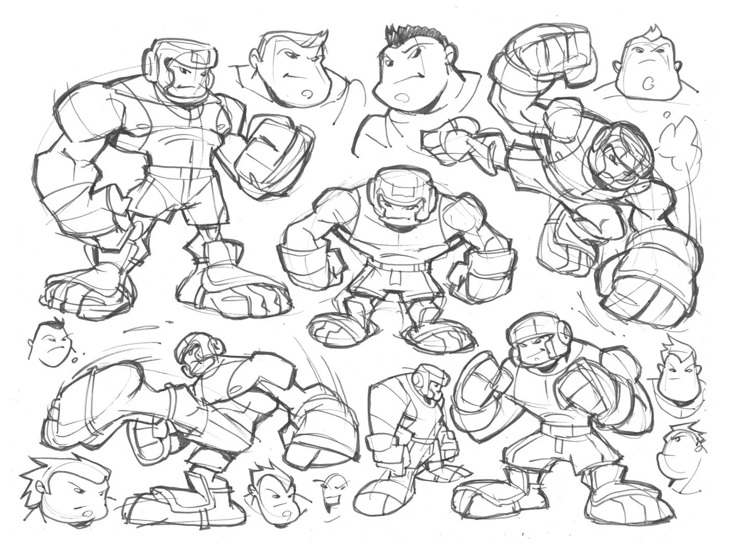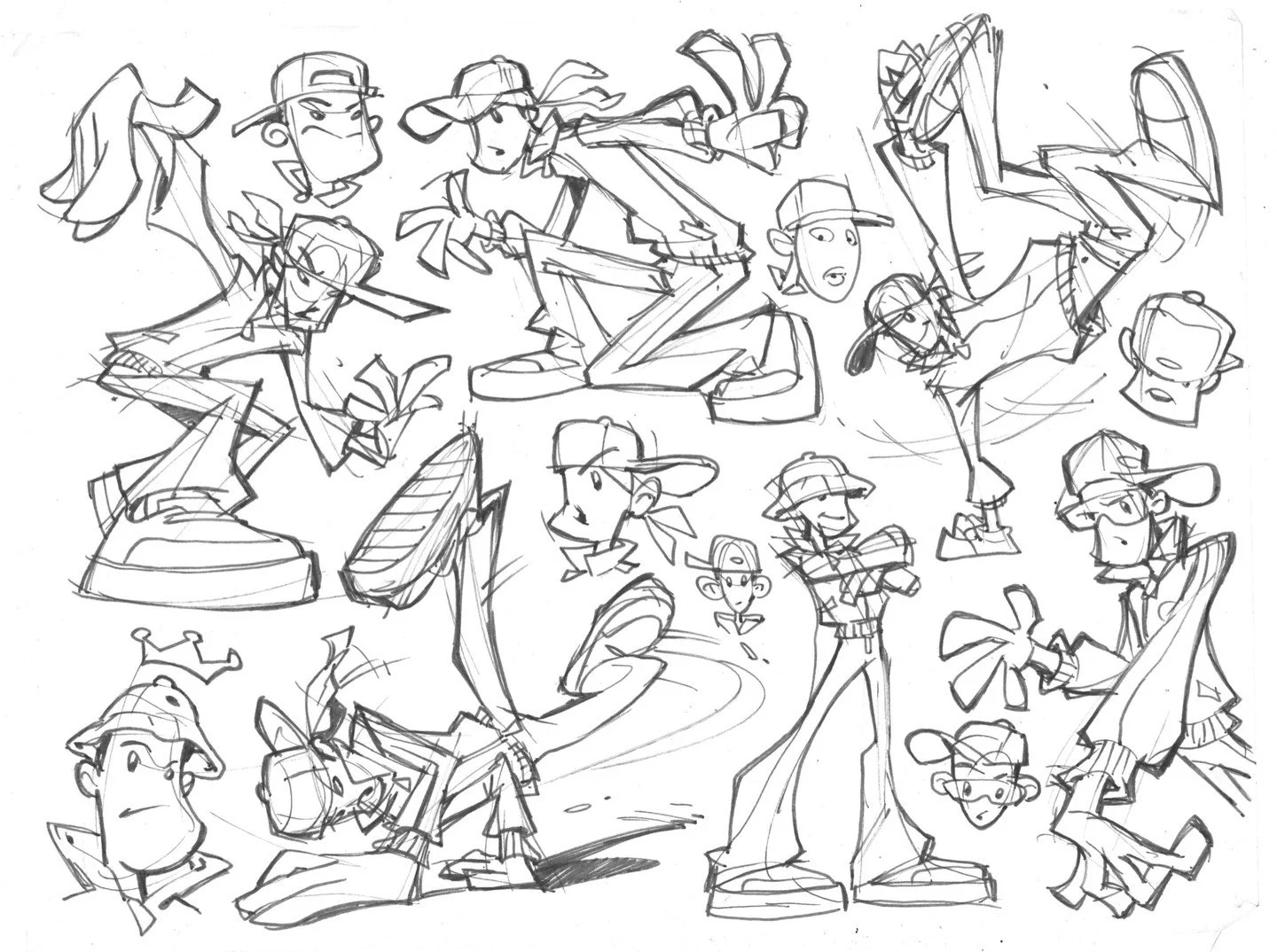 Sketches of cartoon characters in dynamic poses, wearing hats and baggy clothes.