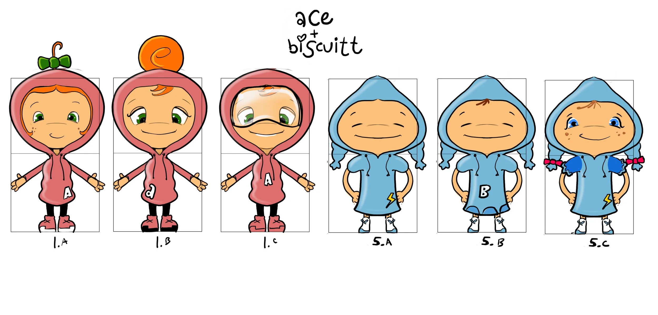 Illustration of cartoon characters from "Ace + Biscuittt." Three characters labeled 1.A, 1.B, 1.C are wearing pink hoodies with "A" and different hairstyles. Three more characters labeled 5.A, 5.B, 5.C are in blue hoodies with "B" and lightning bolts
