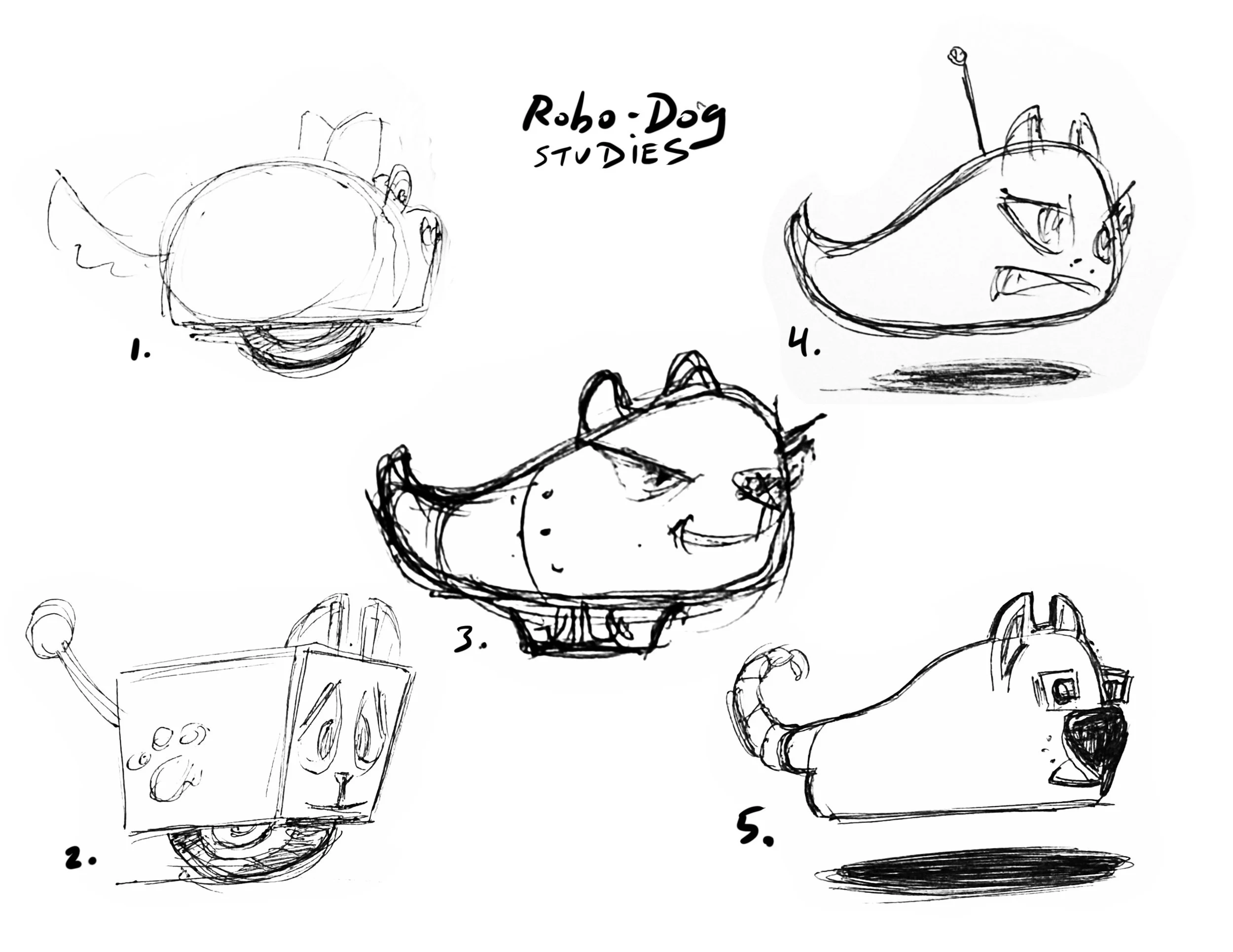 Sketches of five robotic dog designs labeled "Robo-Dog Studies." The designs feature various shapes and expressions, each with unique features such as mechanical parts, antennas, and wheels.