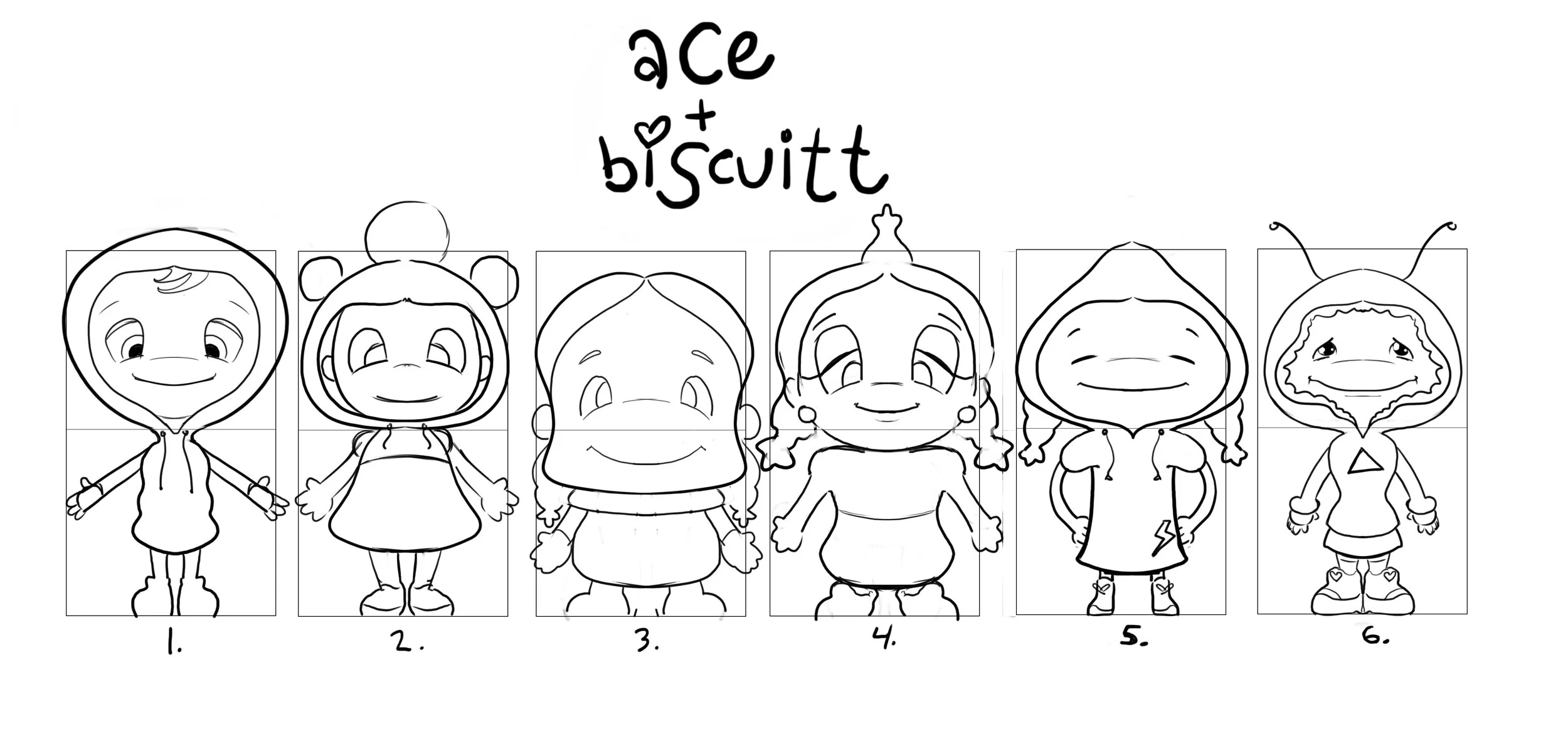 Line drawing of six cartoon characters with unique clothing and features, labeled 1 to 6. The title above reads "Ace + Biscuit."