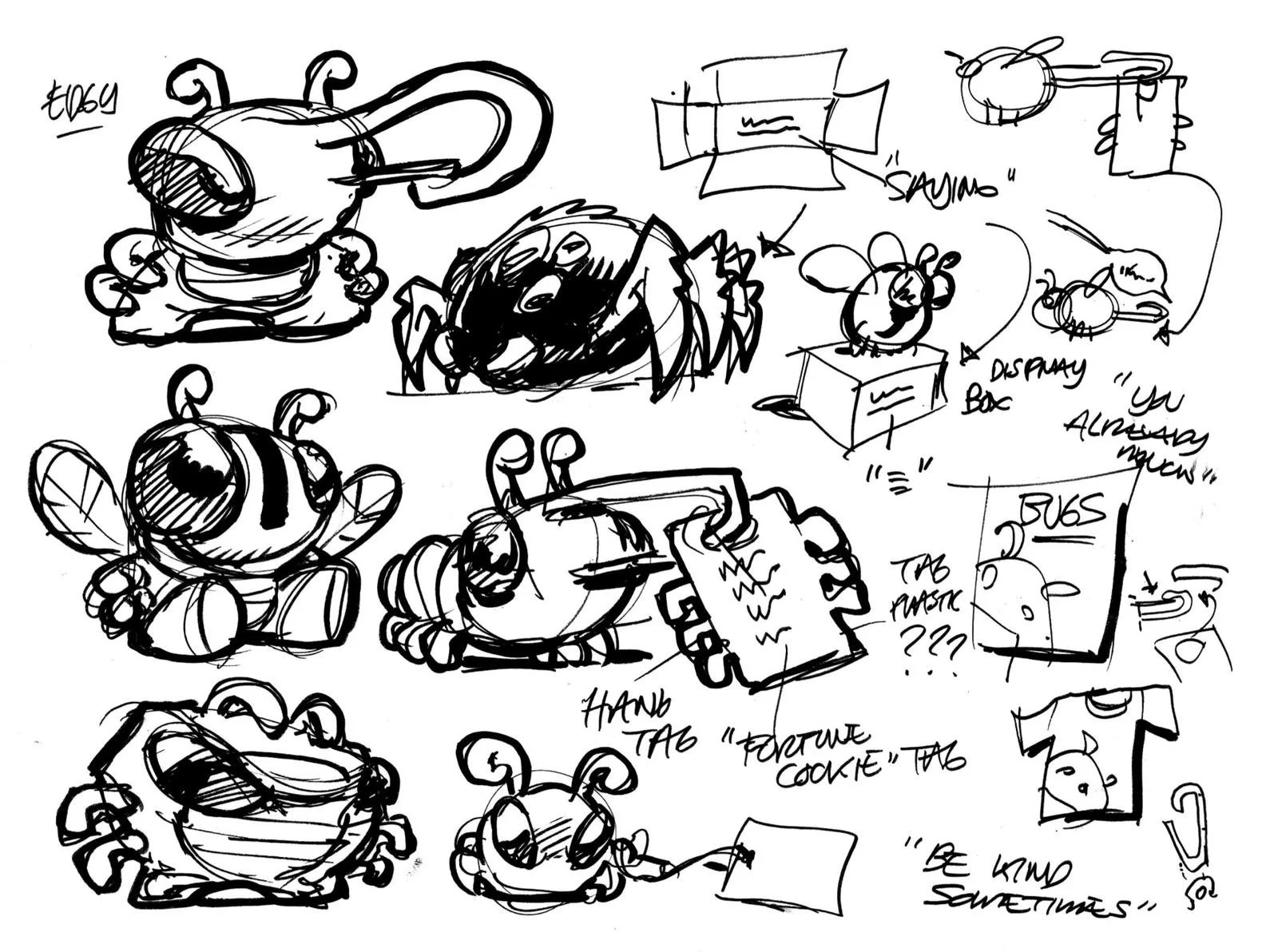 Sketches of cartoon bugs with various expressions and accessories, including bees and insects holding signs or tags. Notes about design ideas and phrases like "be kind sometimes" are scattered around.