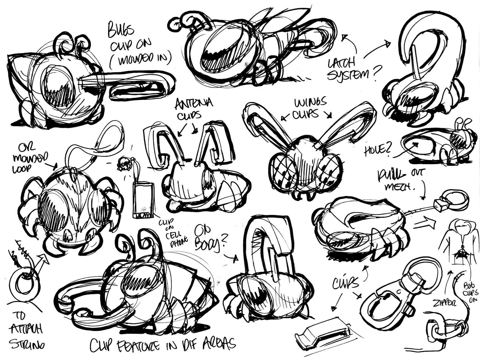 Concept sketches of clip-on bug-shaped accessories, including designs for wearable options and various bug icons for collectible purposes. Annotations discuss color coding, blind box packaging, and ear ring designs.
