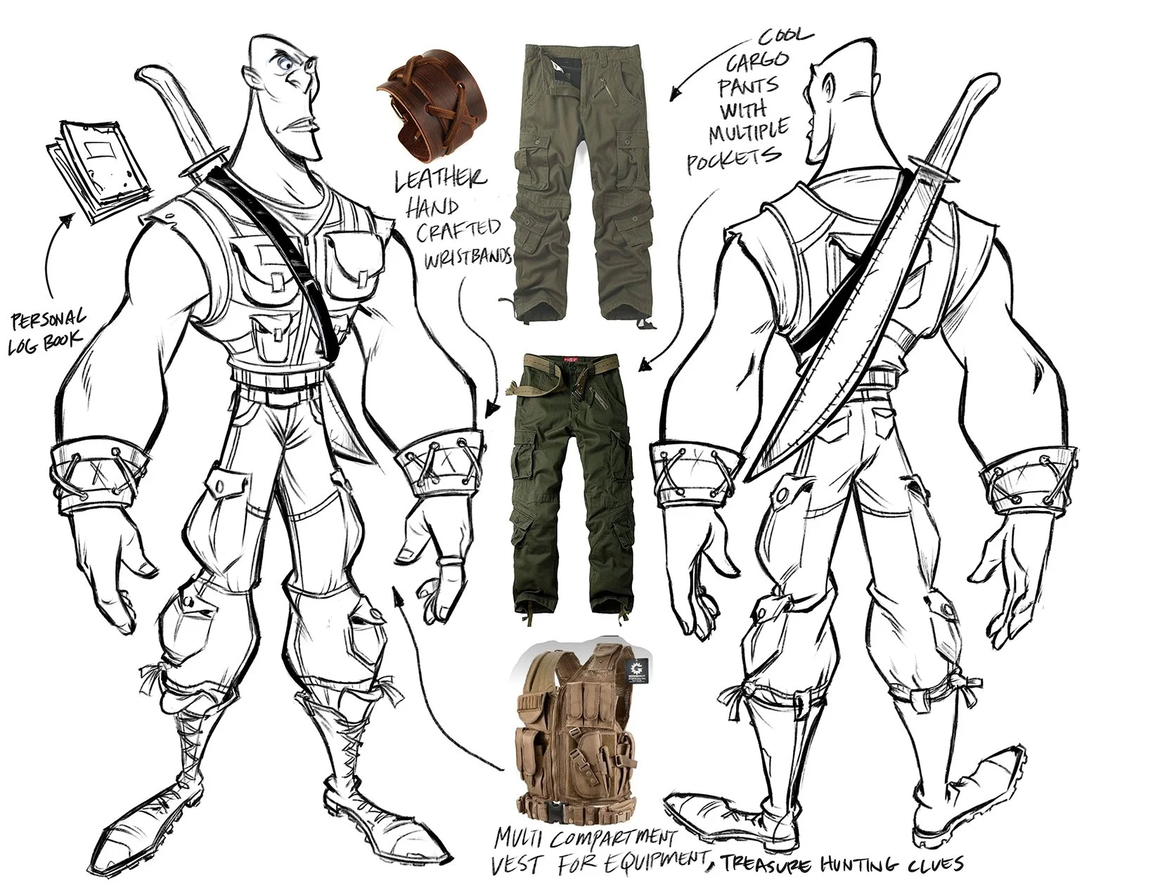 Character design sketch featuring a muscular adventurer with a sword and various gear. Includes drawings of leather wristbands, cargo pants, log book, and a tactical vest. Annotations describe features such as "personal log book," "leather hand craft