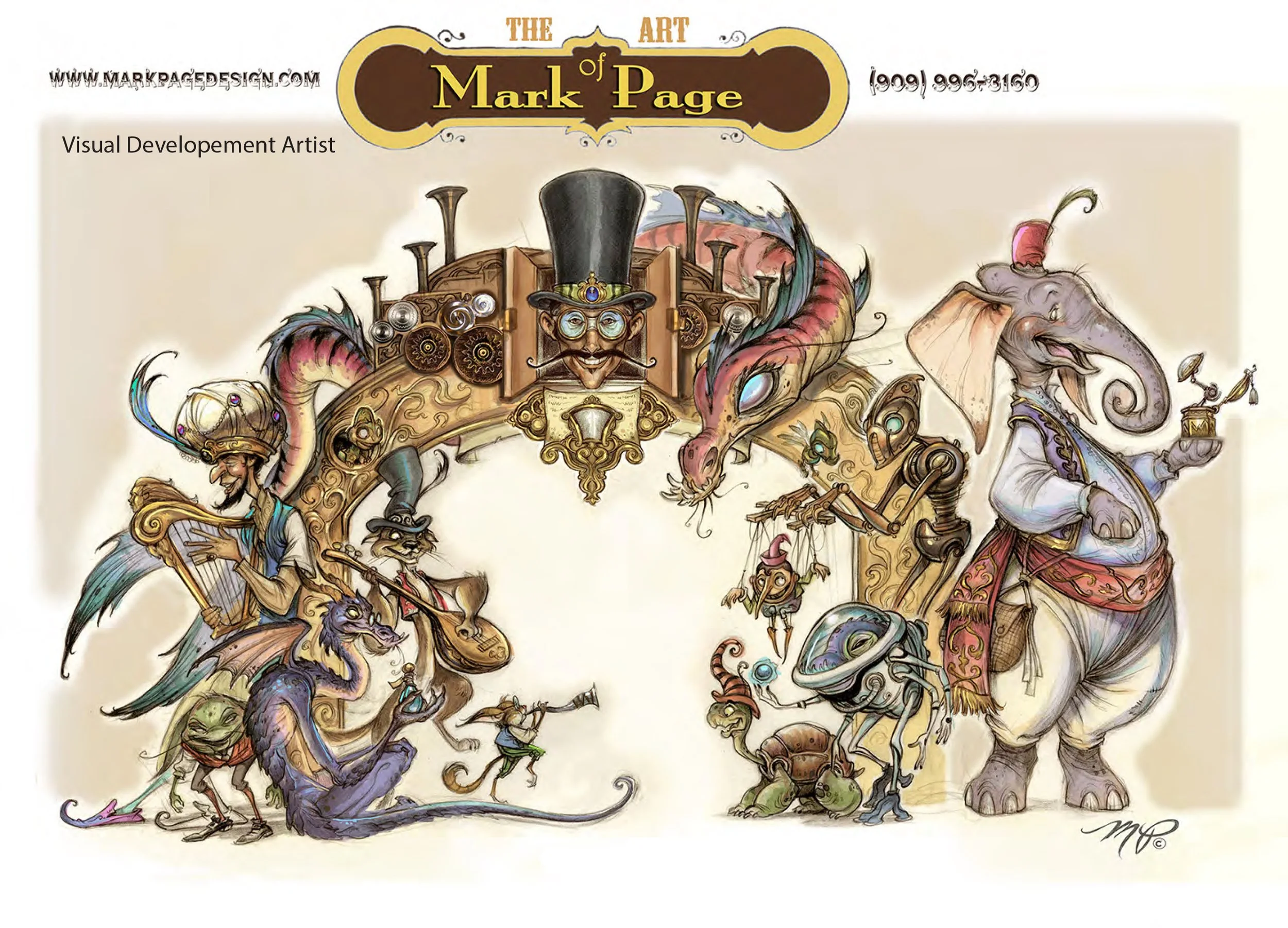 Whimsical illustration featuring various fantasy characters and creatures, such as a dragon, anthropomorphic animals, and an elephant in oriental attire, surrounding a steampunk-style arch with gears and a face wearing a top hat.