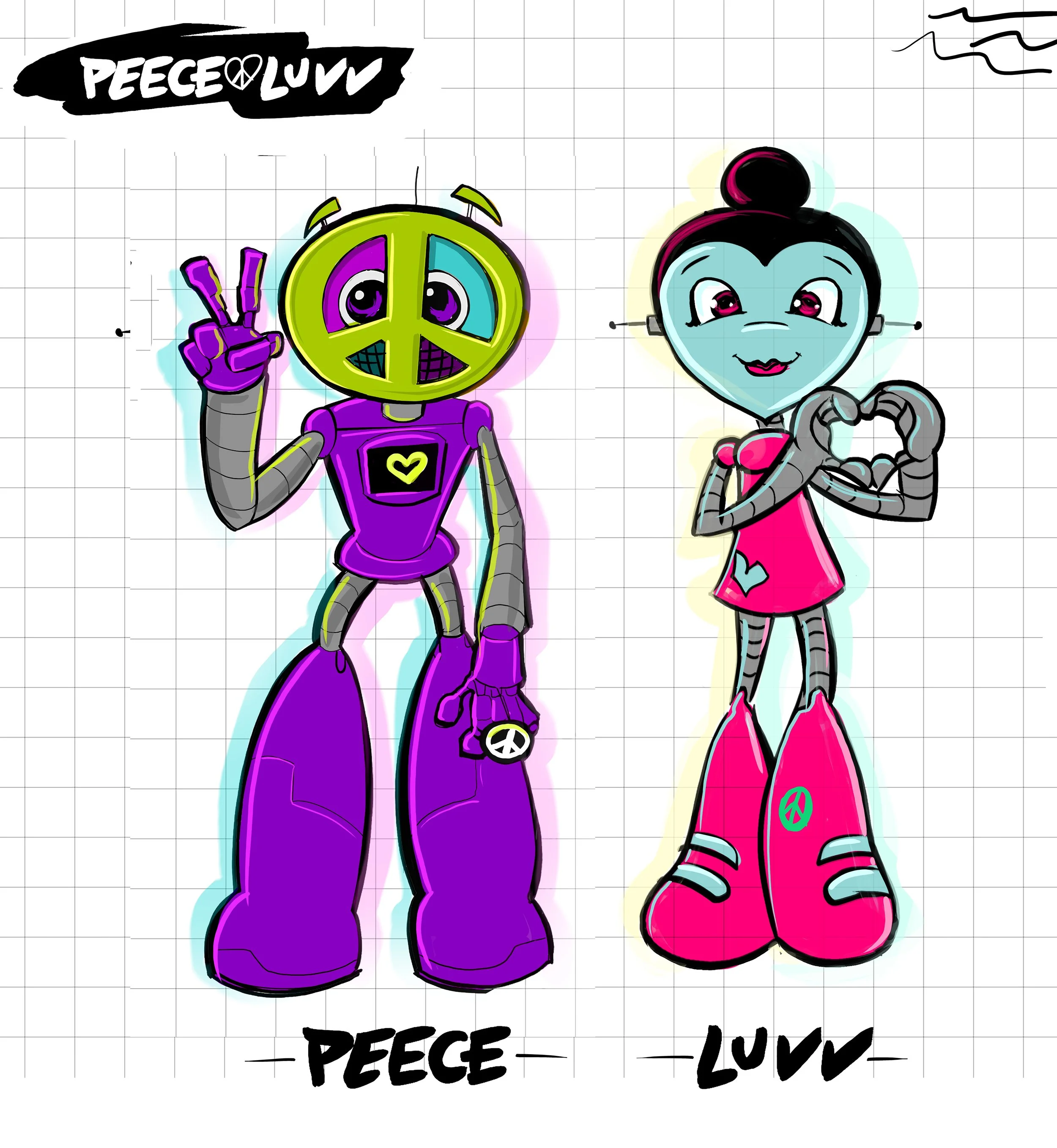 Cartoon robots Peece and Luvv on a grid background, with Peece making a peace sign and Luvv forming a heart with their hands.