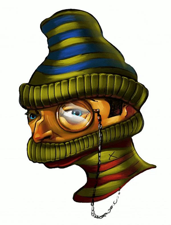 Artistic illustration of a person wearing a striped hat and sweater covering the face, with a monocle. The expression is serious and the color palette includes greens, blues, and reds.