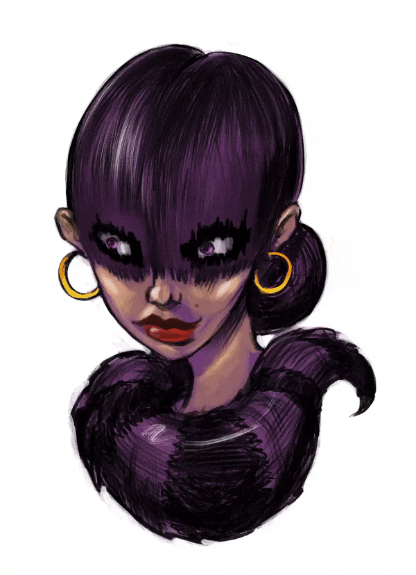 Illustration of a stylized woman with dark bangs, gold hoop earrings, red lipstick, and a feather-like collar on a white background.